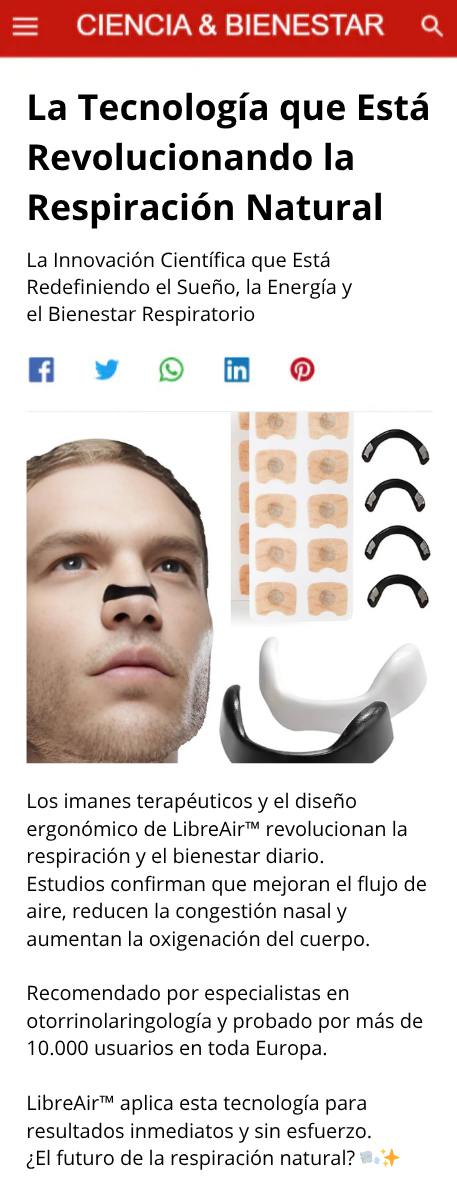 LibreAir™ ha sido diseñado para acompañarte en cada momento de tu día: desde tus entrenamientos más intensos hasta tus noches de descanso profundo. Su tecnología magnética abre suavemente las fosas nasales, mejorando el flujo de aire de manera natural. Siente cómo tu respiración se vuelve más libre, tu mente más clara y tu cuerpo más lleno de energía.